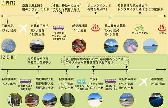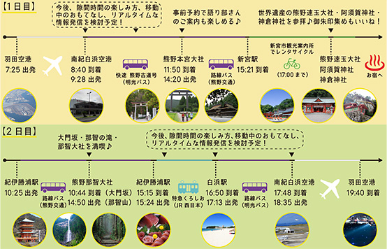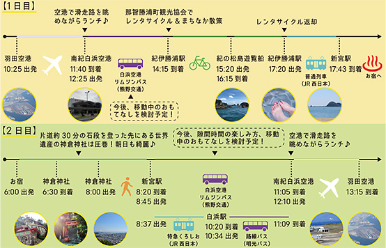 白浜でランチのあと、電車で勝浦・新宮に向かい一泊。翌日は午前中に熊野那智大社と那智の滝を訪れて、電車で白浜に戻って観光を楽しみ、夕方の便で羽田に戻ります。